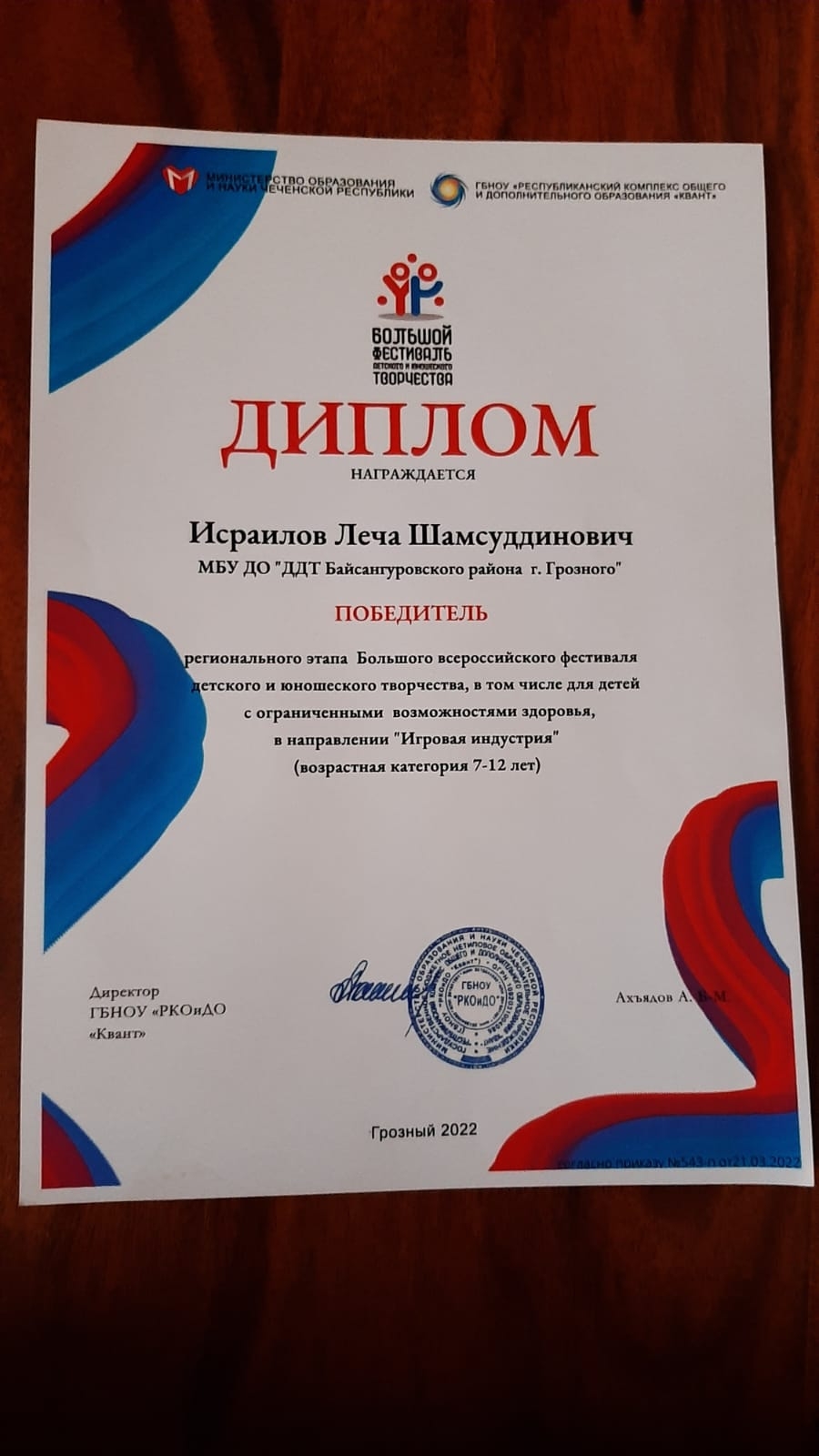 Диплом победителя в региональном этапе Большого всероссийского фестиваля ДЮТ в том числе для детей с ограниченными возможностями здоровья, в направлении "Игровая индустрия" ( возрастная категория 7-12 лет)