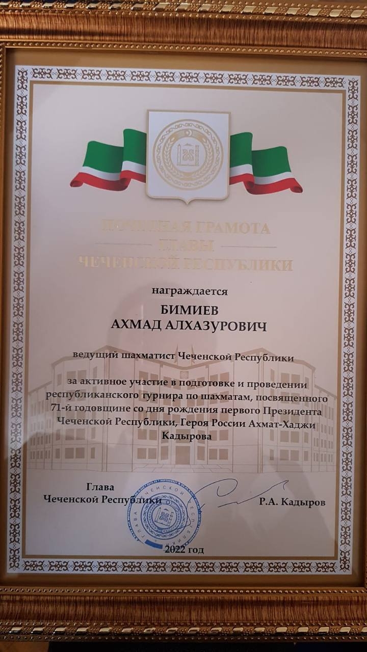 Почетным гостем церемонии закрытия турнира стал Глава Чеченской Республики, Герой России Рамзан Ахматович Кадыров, который лично вручил награды победителям и призерам. Помимо кубка и грамоты победителя Ахмад Алхазурович удостоился Почетной грамоты Главы Чеченской Республики как ведущий шахматист ЧР.