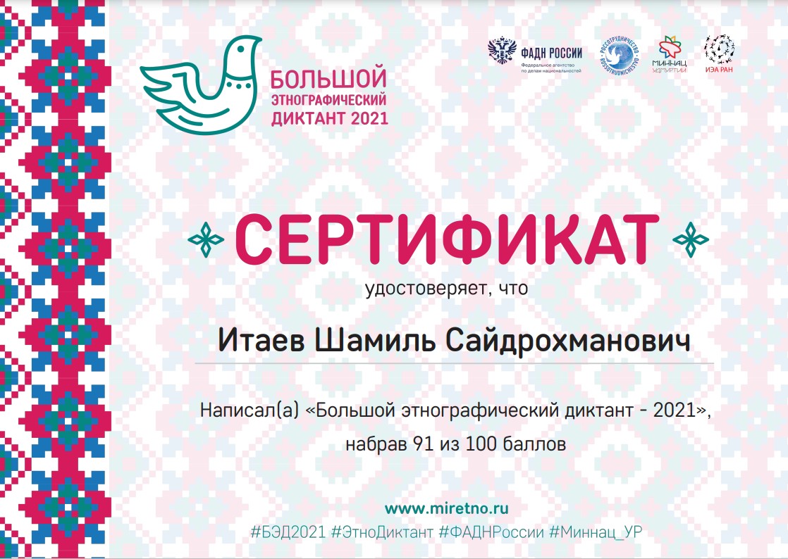 В рамках всероссийского большого этнографического диктанта 2021 Итаев Шамиль Сайдрохманович учитель ОБЖ прошол тест "Большой этнографический диктант -2021", набрав 91 из 100 баллов