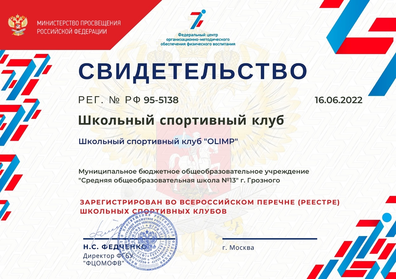 Школьный спортивный клуб OLIMP внесён в список всероссийский перечен (реестров) школьного спортивного клуба.