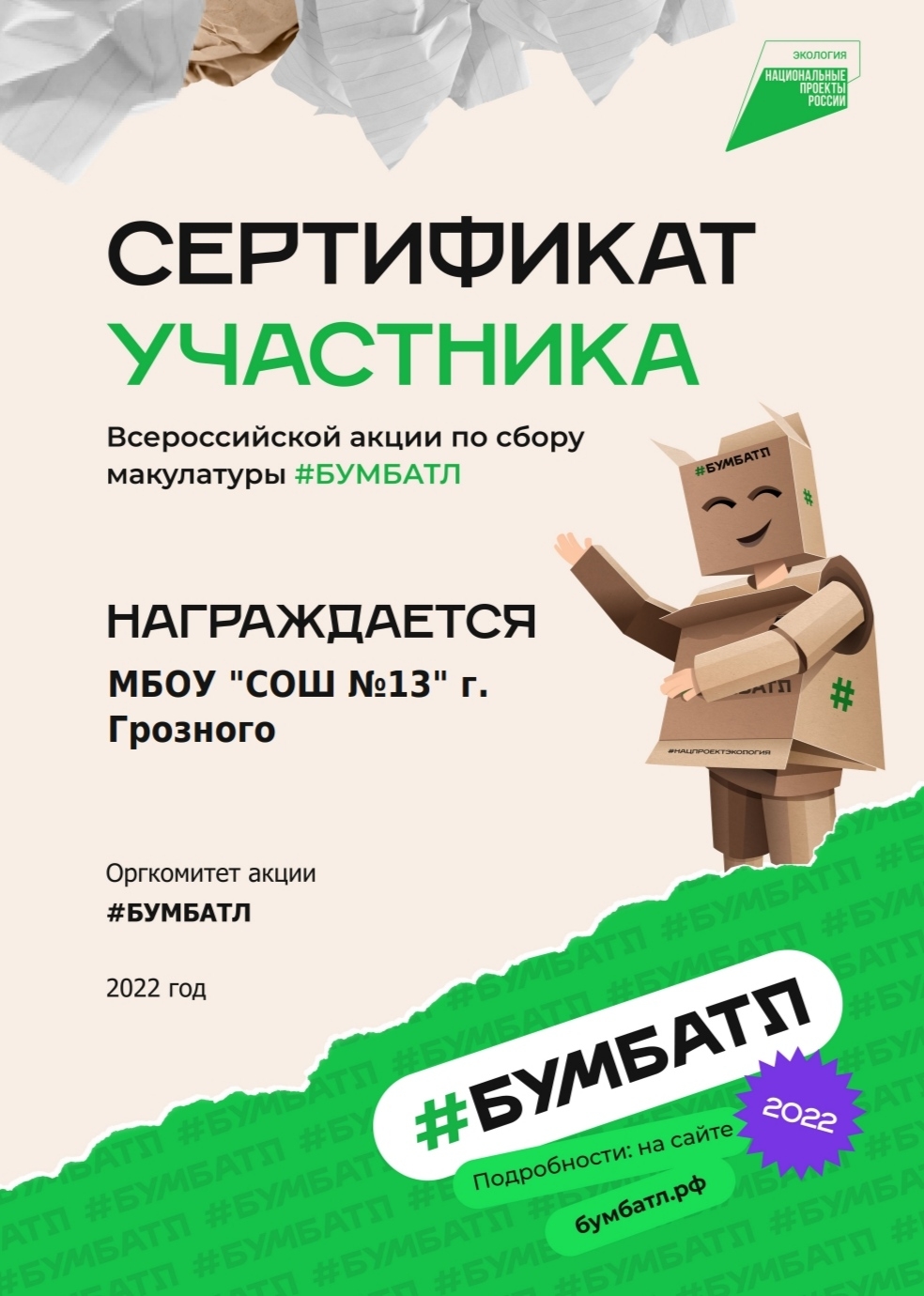 Для участия в мероприятии необходимо собрать и сдать макулатуру на переработку, выложить в соцсеть фото или видеопост с хештегом #Бумбатл#Нацпроект "Экология", оставить заявку на сайте бумбатл.национальныепроекты.рф и получить сертификат участника акции.