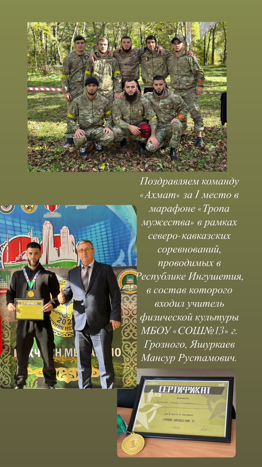 Поздравляем команду «Ахмат» за I место в марафоне «Тропа мужества» в рамках северо-кавказских соревнований, проводимых в Республике Ингушетия, в состав которого входил учитель физической культуры МБОУ «СОШ№13» г. Грозного, Яшуркаев Мансур Рустамович. Дала т1аьхье беркате йойла!