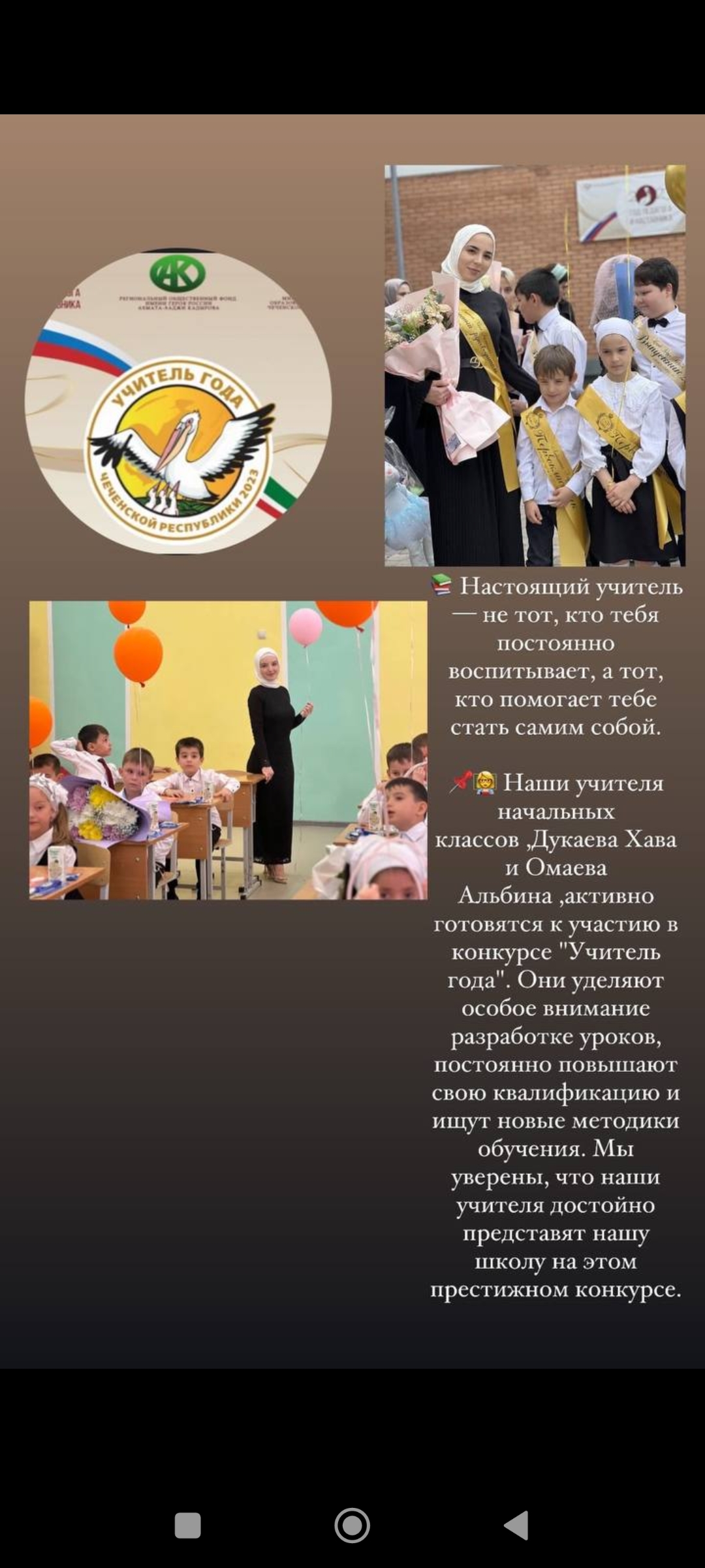 📌👩🏫 Наши учителя начальных классов ,Дукаева Хава и Омаева Альбина ,активно готовятся к участию в конкурсе "Учитель года". Они уделяют особое внимание разработке уроков, постоянно повышают свою квалификацию и ищут новые методики обучения. Мы уверены, что наши учителя достойно представят нашу школу на этом престижном конкурсе.