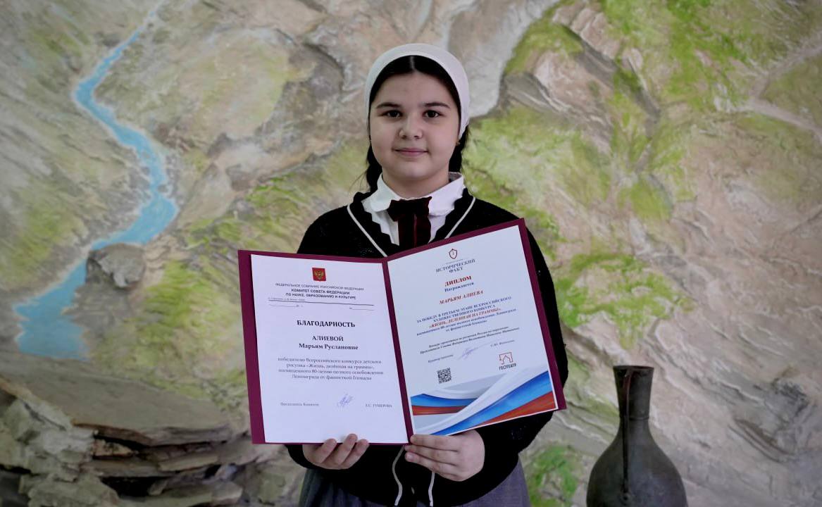 В этом году на конкурс было представлено более 100 тысяч работ. В Совете Федерации представили картины 24 победителей, в числе которых рисунок ученицы 4 «В» класса МБОУ «Математическая школа № 1 имени Х. И. Ибрагимова» г. Грозного - Марьям Алиевой.
