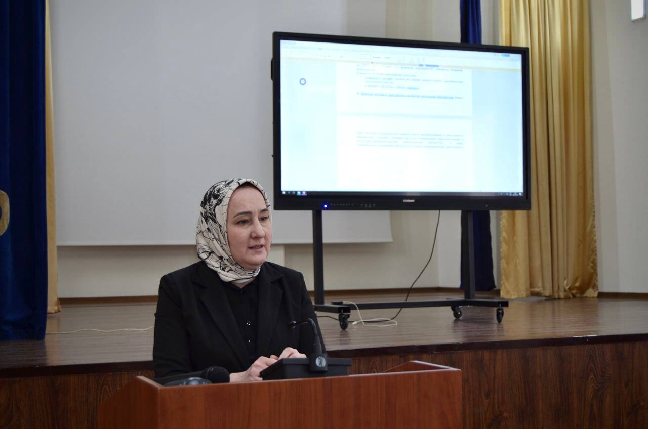 Хадишат Мадаева, руководитель ГМО педагогов-библиотекарей г. Грозного, ознакомила участников с нормативной документацией, необходимой для работы ШИБЦ и школьных библиотек, а также с этапами формирования библиотечного фонда.