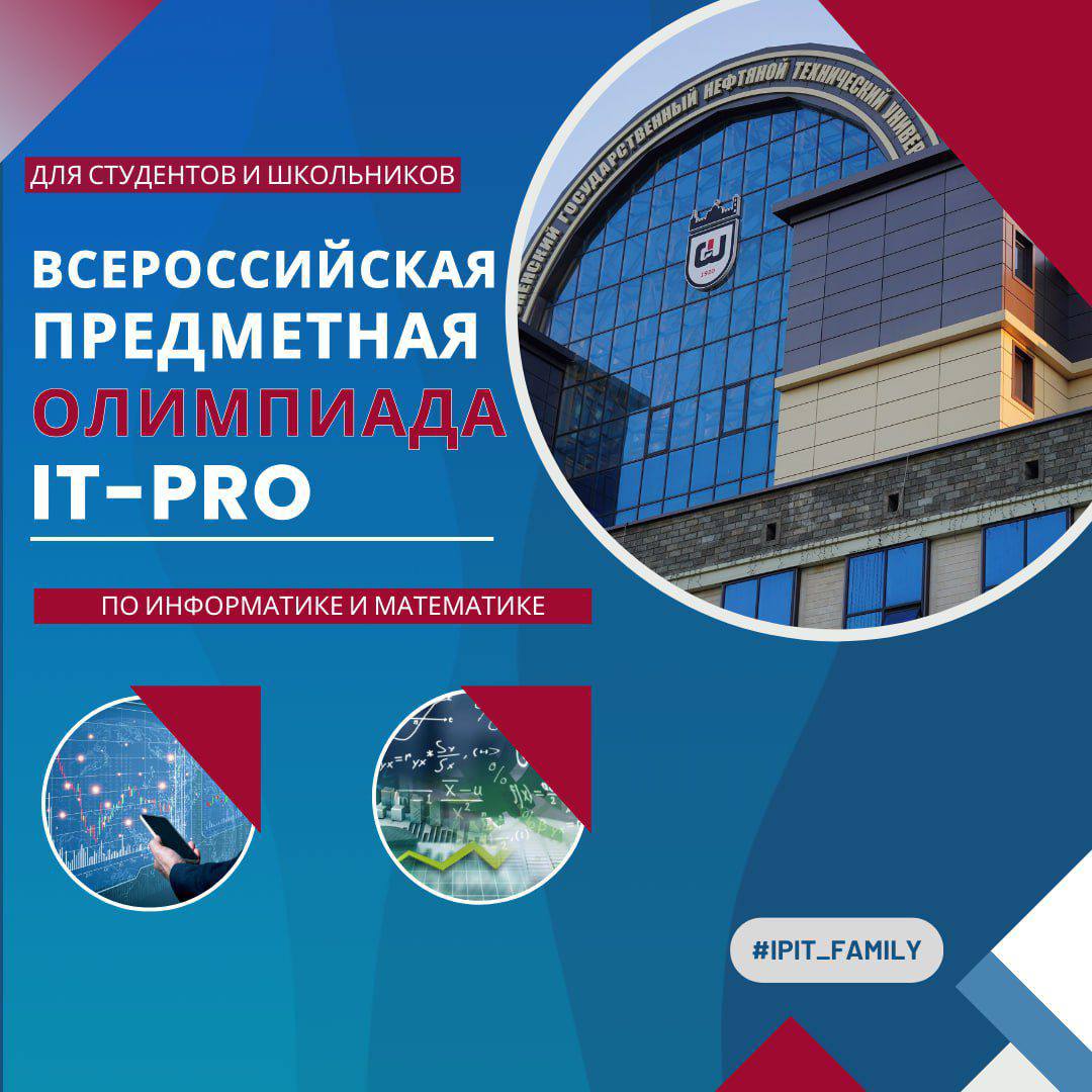Институт прикладных информационных технологий ГГНТУ проводит Всероссийскую олимпиаду «IT-Pro» по информатике и математике для школьников и студентов СПО с целью выявления и развития интеллектуальных способностей участников, а также стимулирования их интереса к проектной и научно-исследовательской деятельности.