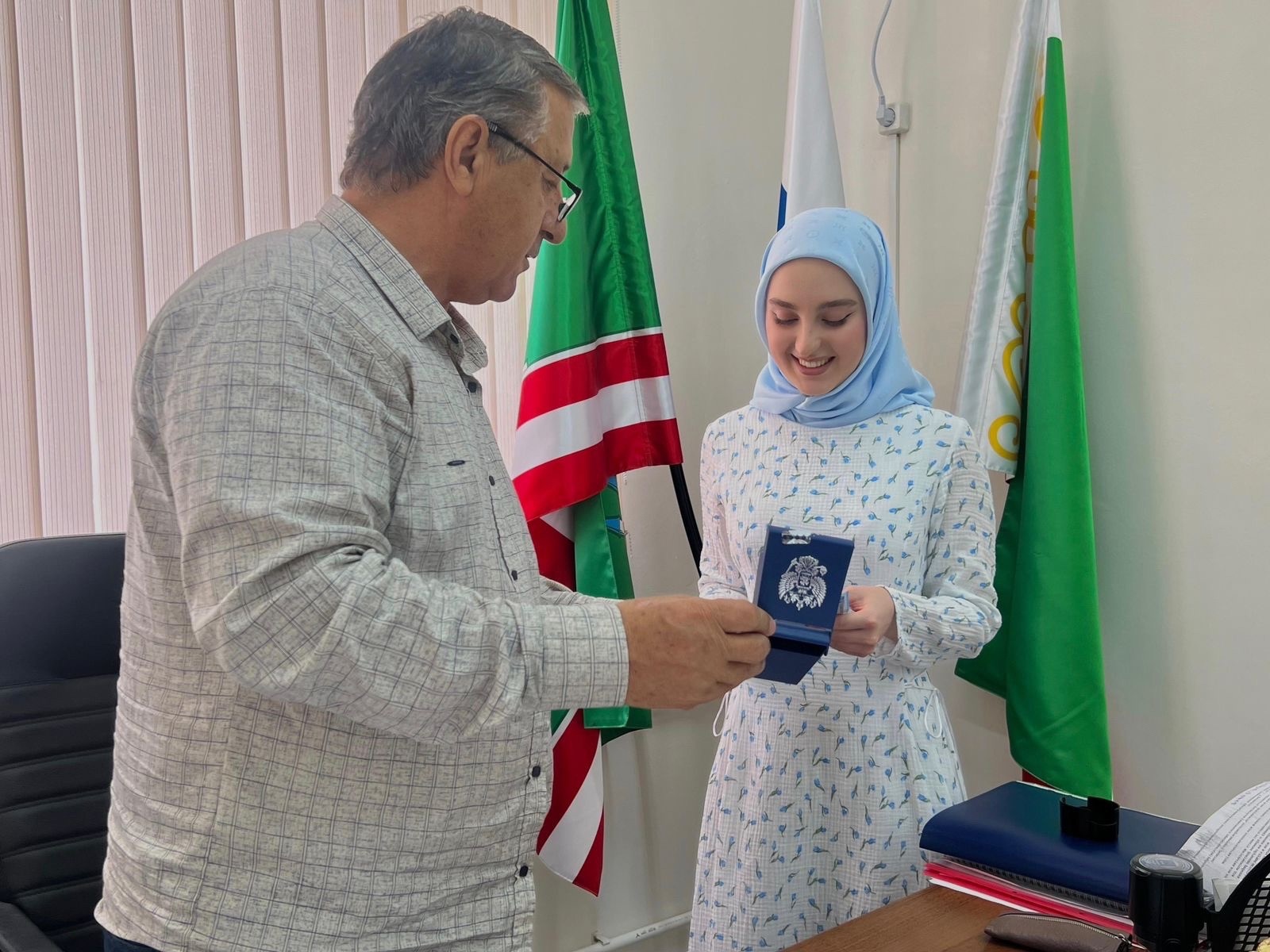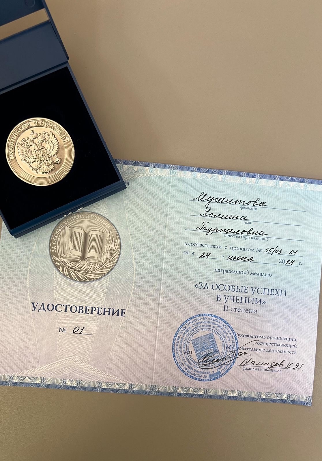 Мусаитова Ясмина Турпаловна ученица 11 класса МБОУ «СОШ 13» г.Грозного, получила медаль «За особые успехи в учении» II степени. Дала т1аьхье беркате йойла!