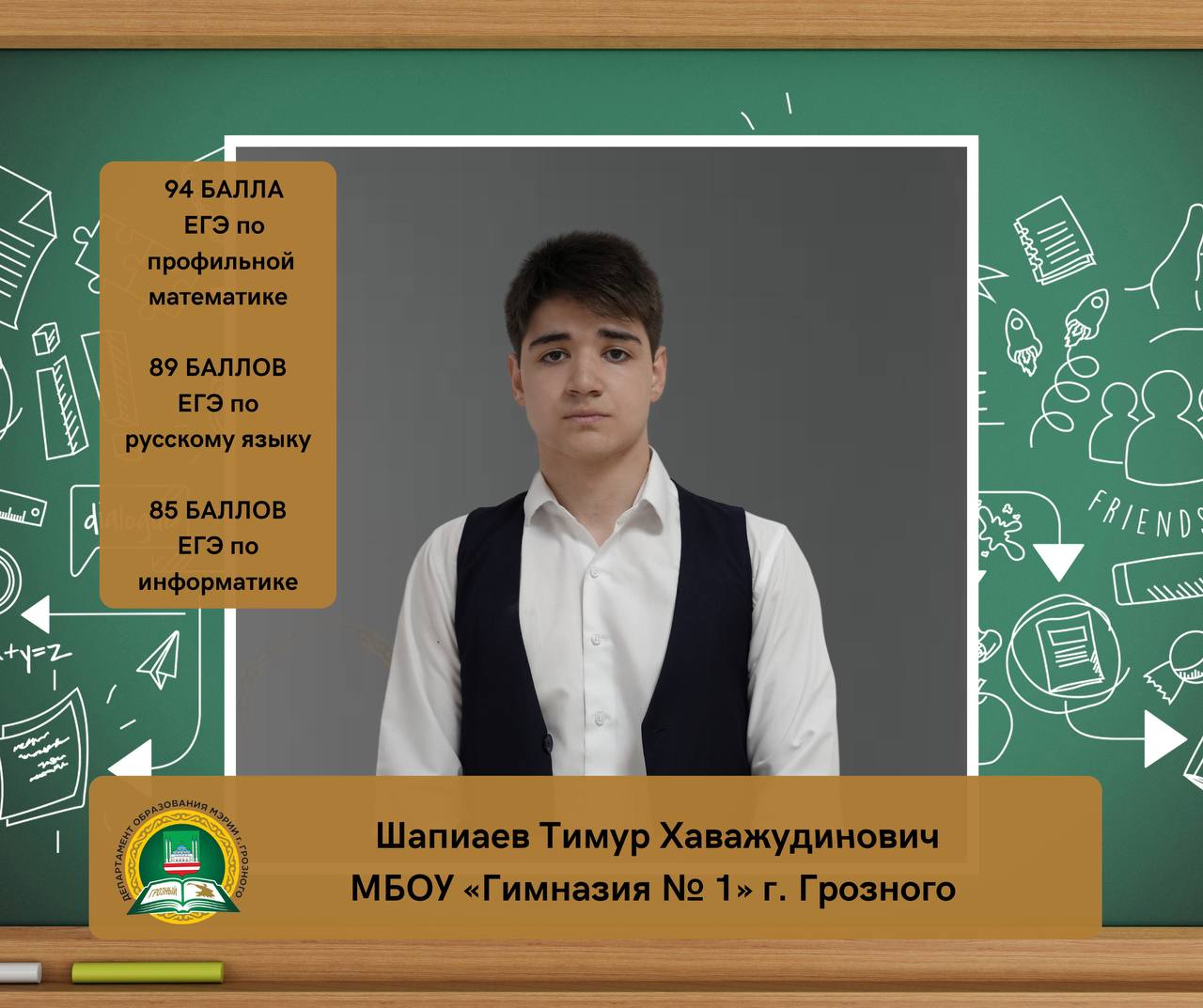 Шапиаев Тимур Хаважудинович, ученик МБОУ «Гимназия № 1 имени А.А. Кадырова» г. Грозного, набрал на ЕГЭ 94 балла по профильной математике, 89 баллов по русскому языку и 85 баллов по информатике (КЕГЭ).