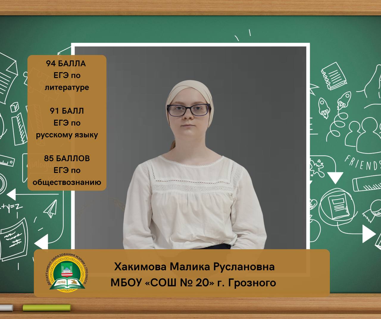 Хакимова Малика Руслановна, ученица МБОУ «СОШ № 20 имени М.С. Ташухаджиева» г. Грозного, набрала на ЕГЭ 94 балла по литературе, 91 балл по русскому языку и 85 баллов по обществознанию.