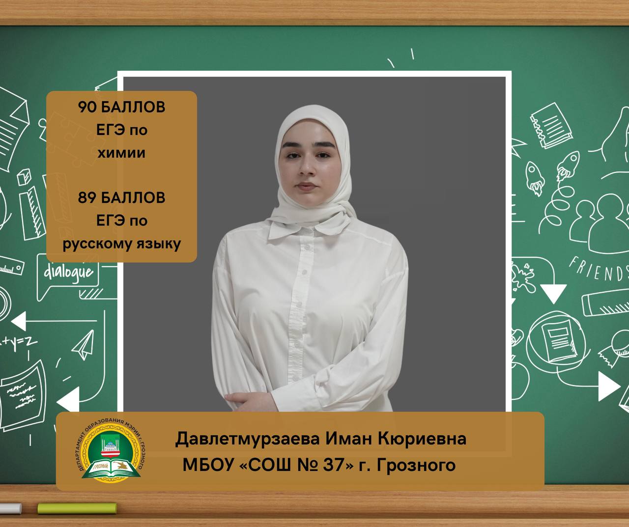 Давлетмурзаева Иман Кюриевна, ученица МБОУ «СОШ № 37» г. Грозного, набрала на ЕГЭ 90 баллов по химии и 89 баллов по русскому языку.