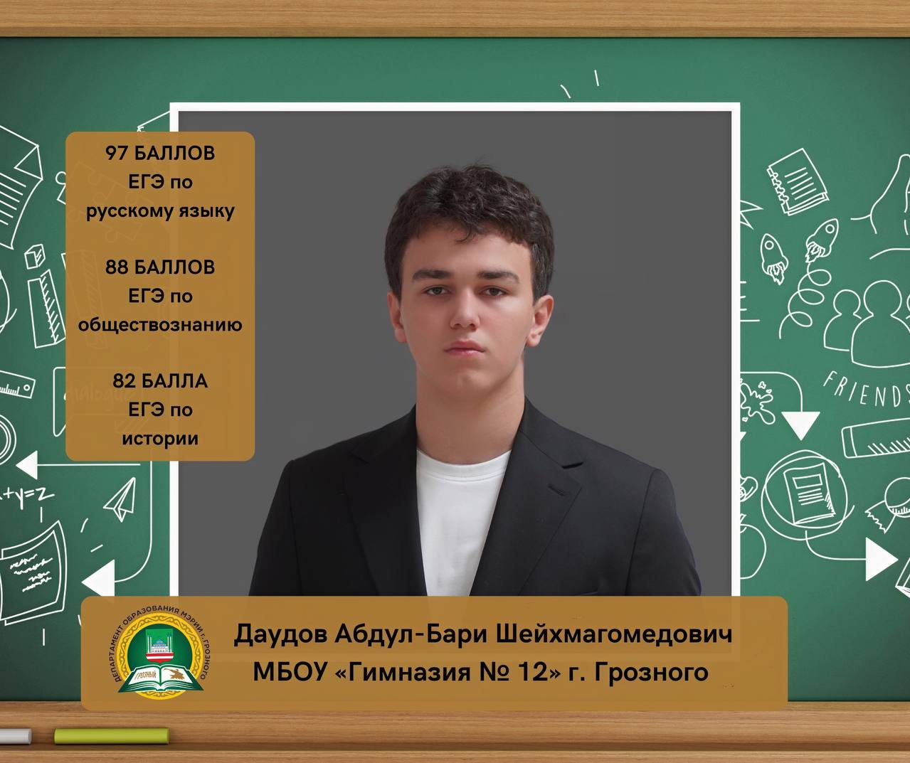 Даудов Абдул-Бари Шейхмагомедович, ученик МБОУ «Гимназия № 12» г. Грозного, набрал на ЕГЭ 97 баллов по русскому языку, 88 баллов по обществознанию и 82 балла по истории.