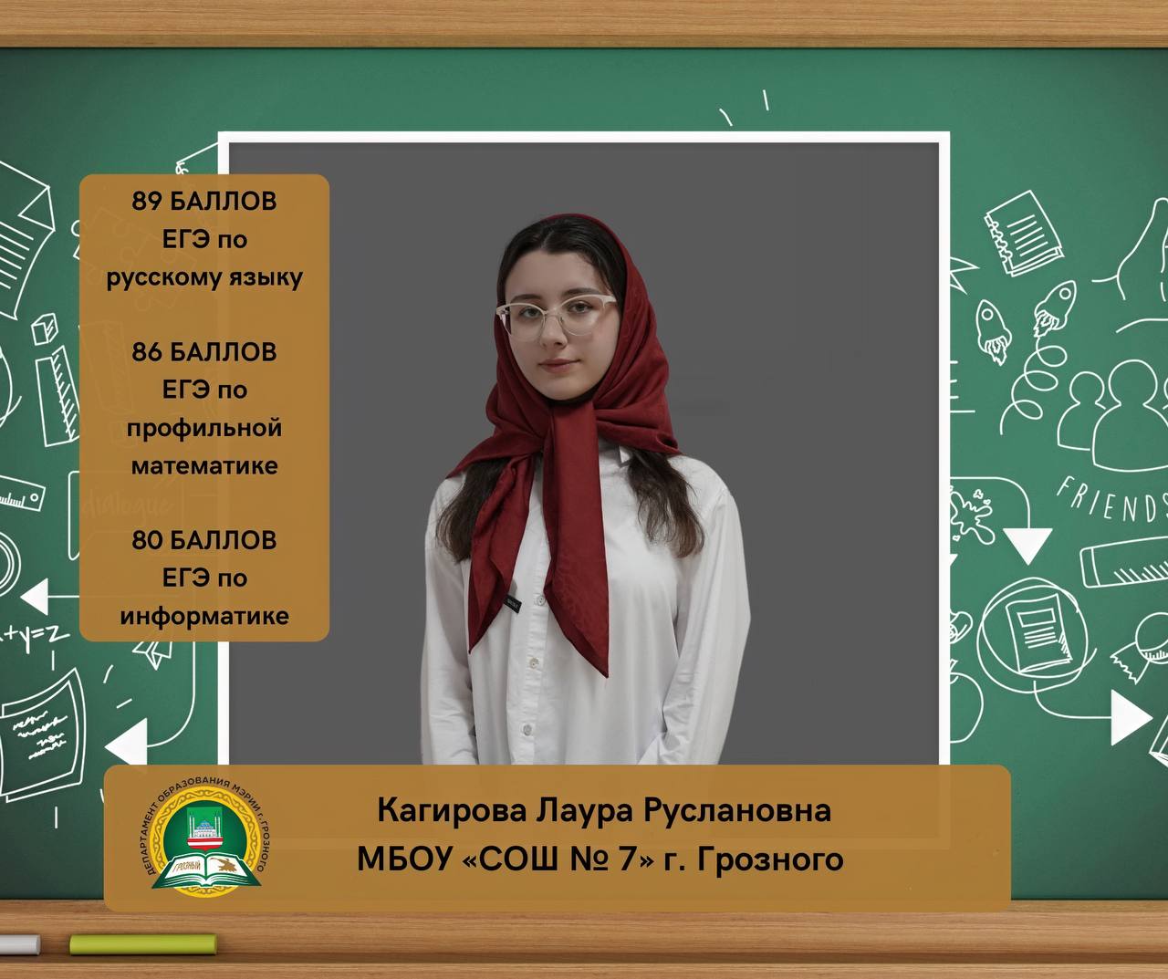 Кагирова Лаура Руслановна, ученица МБОУ «СОШ № 7» г. Грозного, набрала на ЕГЭ 89 баллов по русскому языку, 86 баллов по профильной математике и 80 баллов по информатике (КЕГЭ).