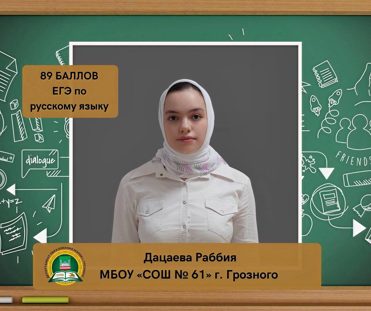 Дацаева Раббия, ученица МБОУ «СОШ № 61» г. Грозного, набрала 89 баллов на ЕГЭ по русскому языку.