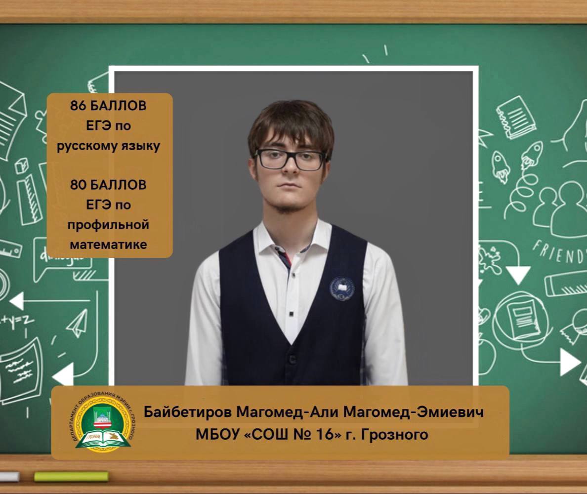 Байбетиров Магомед-Али Магомед-Эмиевич, ученик МБОУ «СОШ № 16» г. Грозного, набрал на ЕГЭ 86 баллов по русскому языку и 80 баллов по профильной математике.