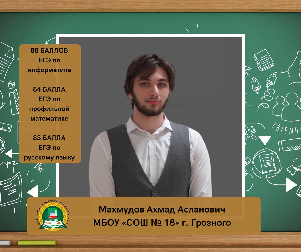 Махмудов Ахмад Асланович, ученик МБОУ «СОШ № 18» г. Грозного, набрал на ЕГЭ 88 баллов по информатике (КЕГЭ), 84 балла по профильной математике и 83 балла по русскому языку.