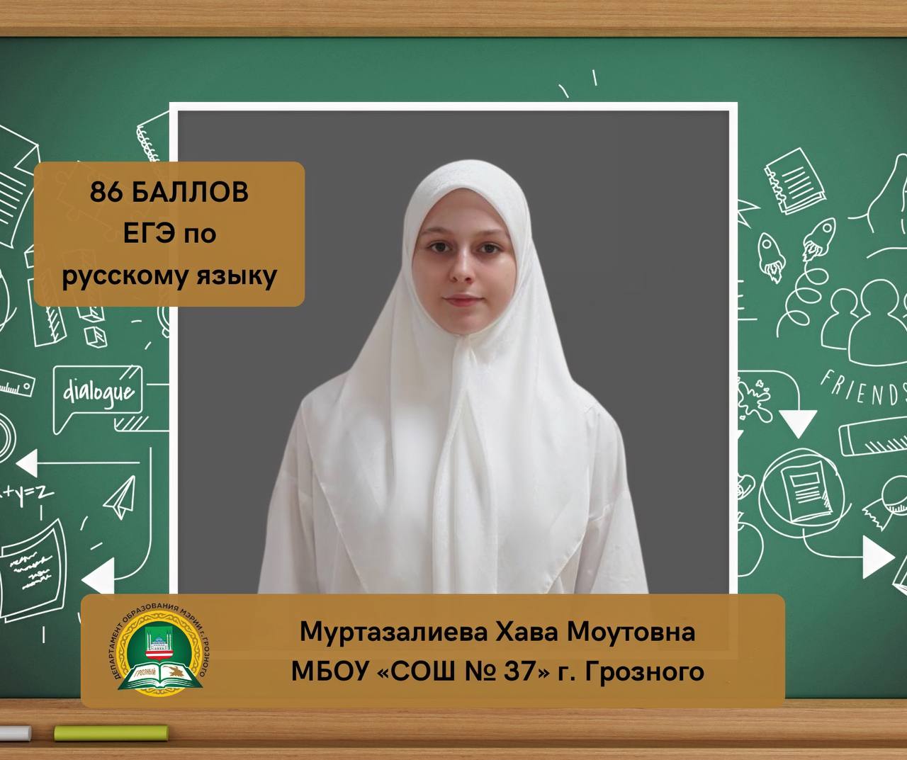 Муртазалиева Хава Моутовна, ученица МБОУ «СОШ № 37» г. Грозного, набрала 86 баллов на ЕГЭ по русскому языку.