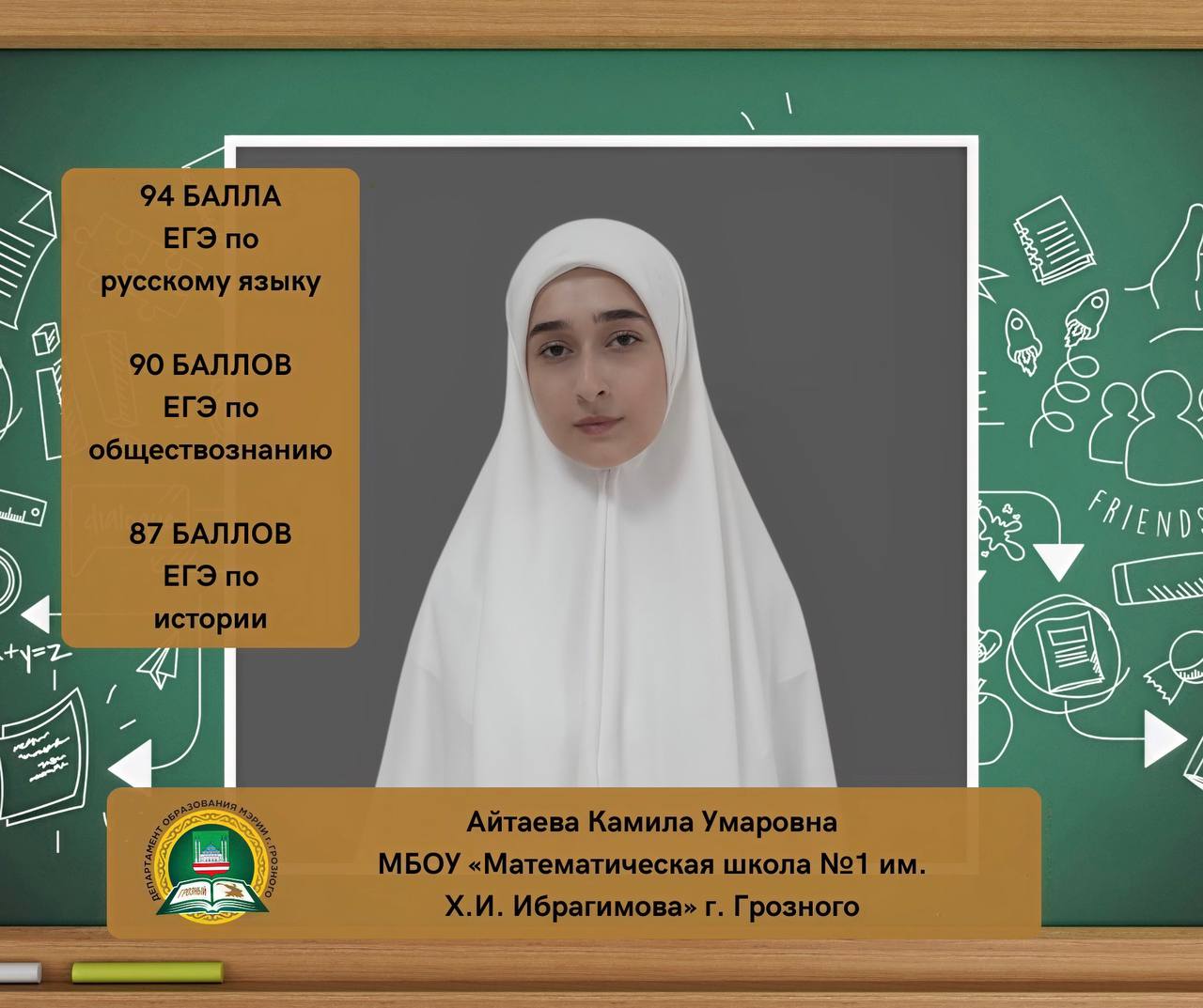 Айтаева Камила Умаровна, ученица МБОУ «Математическая школа № 1 им. Х.И. Ибрагимова» г. Грозного, набрала на ЕГЭ 94 балла по русскому языку, 90 баллов по обществознанию и 87 баллов по истории.