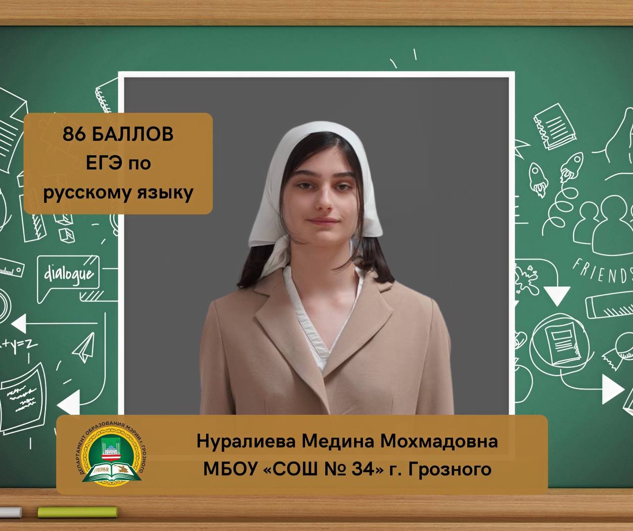 Нуралиева Медина Мохмадовна, ученица МБОУ «СОШ № 34» г. Грозного, набрала 86 баллов на ЕГЭ по русскому языку.