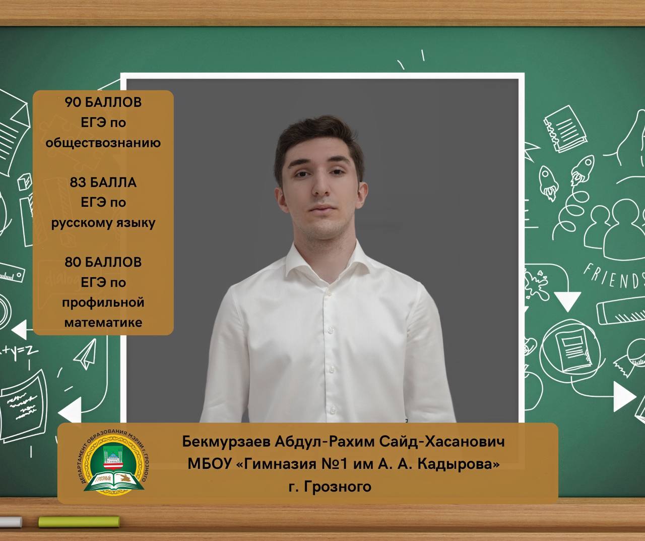 Бекмурзаев Абдул-Рахим Сайд-Хасанович, ученик МБОУ «Гимназия № 1 имени А.А. Кадырова» г. Грозного, набрал на ЕГЭ 90 баллов по обществознанию, 83 балла по русскому языку и 80 баллов по профильной математике.