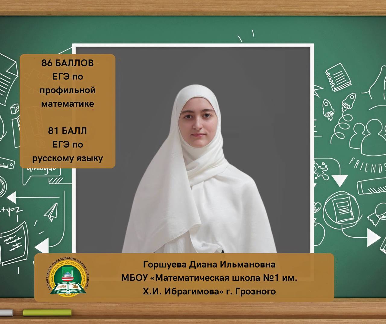 Горшуева Диана Ильмановна, ученица МБОУ «Математическая школа № 1 им. Х.И. Ибрагимова» г. Грозного, набрала на ЕГЭ 86 баллов по профильной математике и 81 балл по русскому языку.