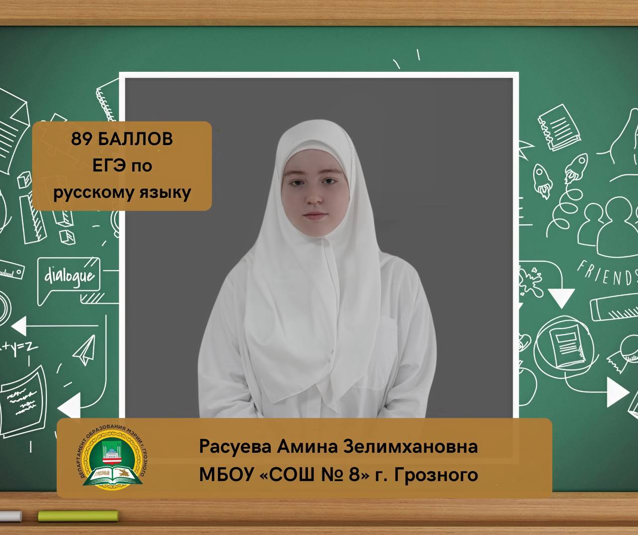Расуева Амина Зелимхановна, ученица МБОУ «СОШ № 8» г. Грозного, набрала 89 баллов на ЕГЭ по русскому языку.