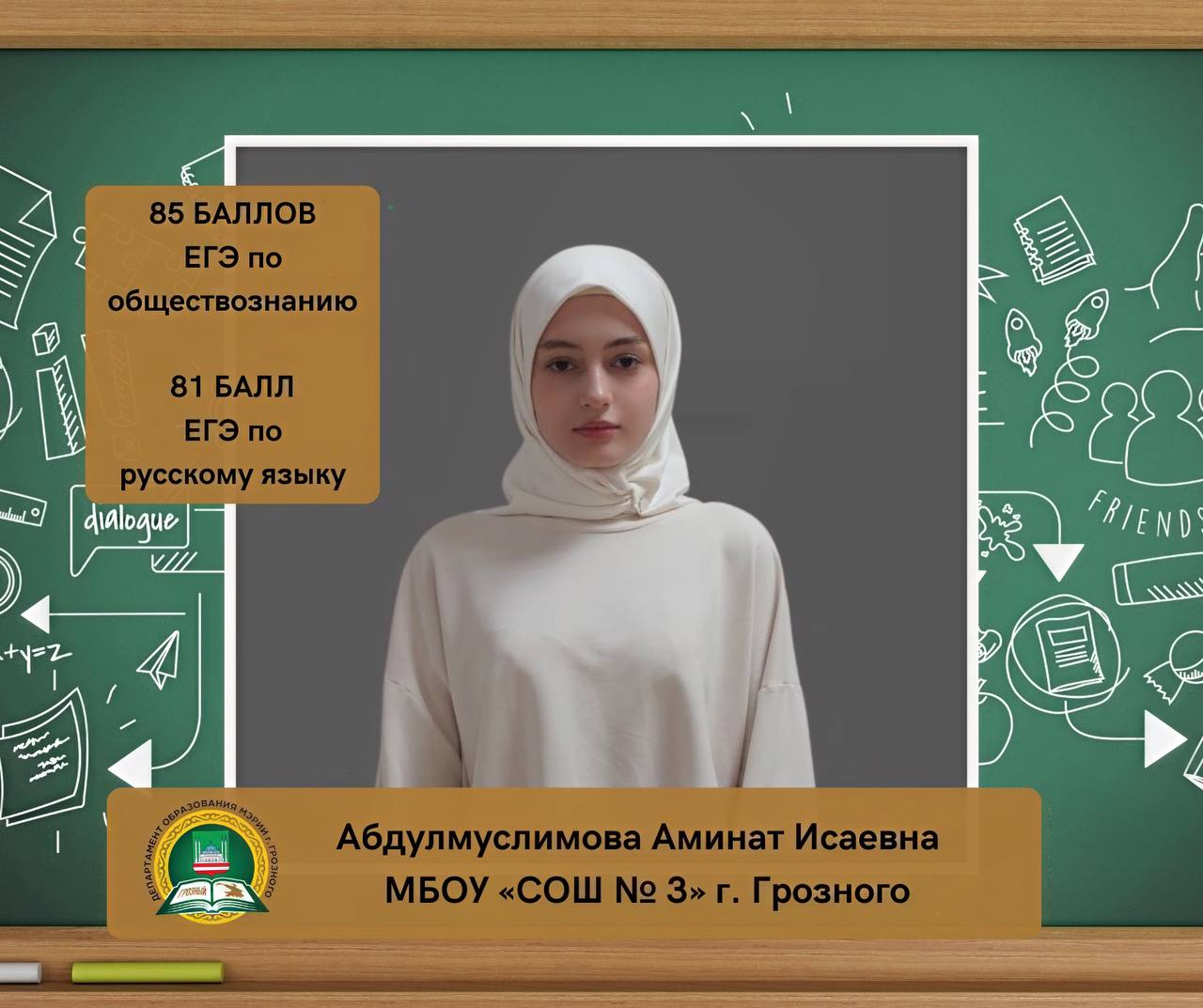 Абдулмуслимова Аминат Исаевна, ученица МБОУ «СОШ № 3» г. Грозного, набрала на ЕГЭ 85 баллов по обществознанию и 81 балл по русскому языку.