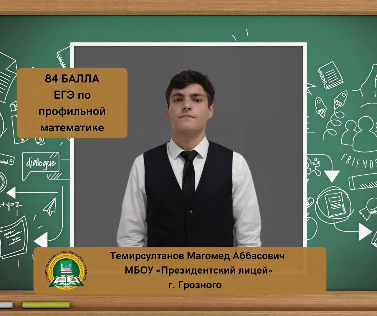 Темирсултанов Магомед Аббасович, ученик МБОУ «Президентский лицей» г. Грозного, набрал 84 балла на ЕГЭ по профильной математике.