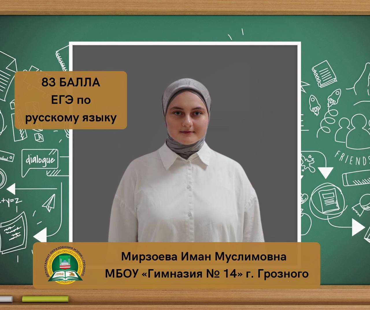 Мирзоева Иман Муслимовна, ученица МБОУ «Гимназия № 14» г. Грозного, набрала 83 балла на ЕГЭ по русскому языку.