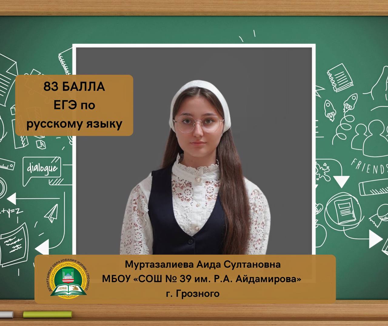 Муртазалиева Аида Султановна, ученица МБОУ «СОШ № 39 им. Р.А. Айдамирова» г. Грозного, набрала 83 балла на ЕГЭ по русскому языку.