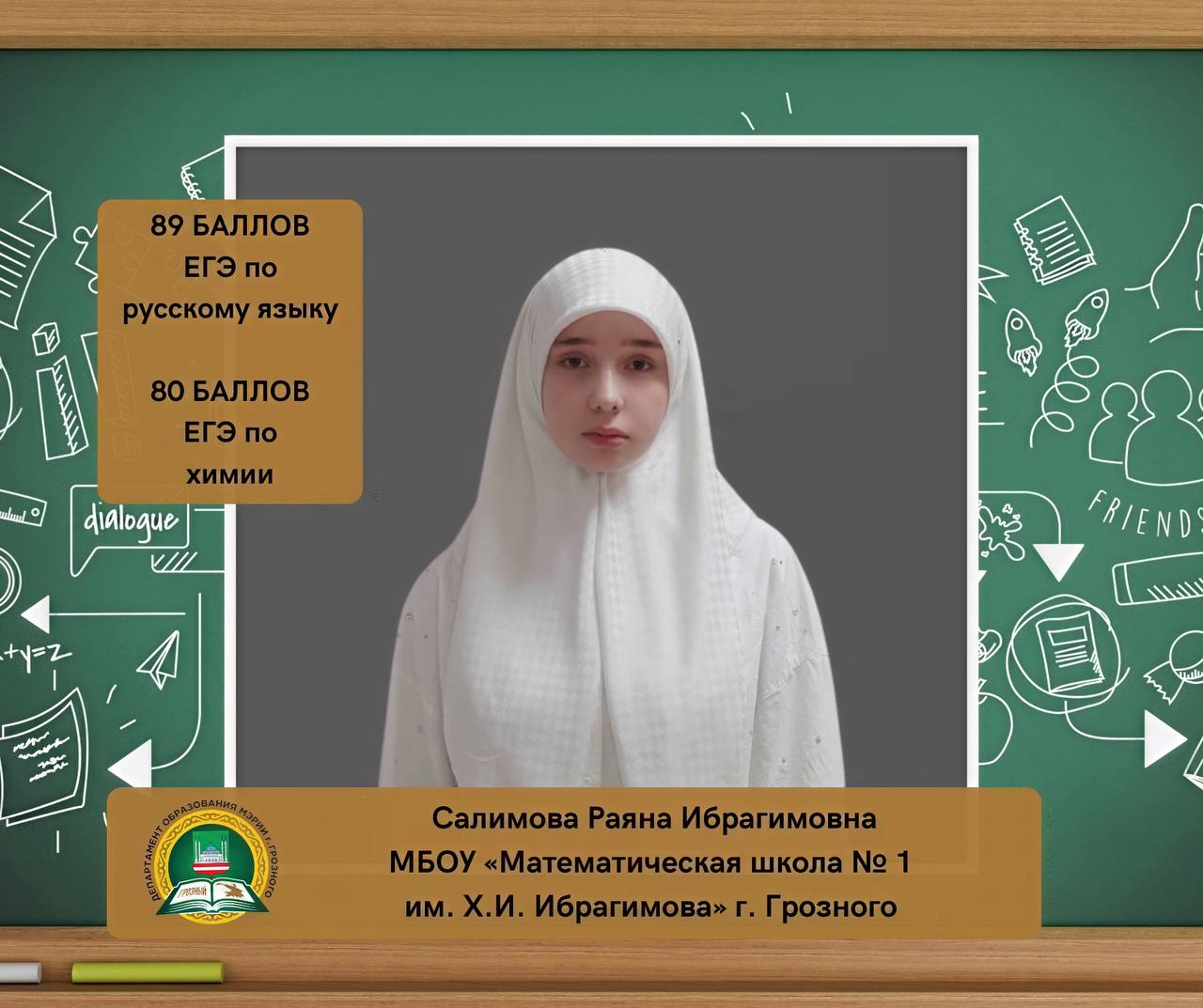 Салимова Раяна Ибрагимовна, ученица МБОУ «Математическая школа № 1 им. Х.И. Ибрагимова» г. Грозного, набрала на ЕГЭ 89 баллов по русскому языку и 80 баллов по химии.