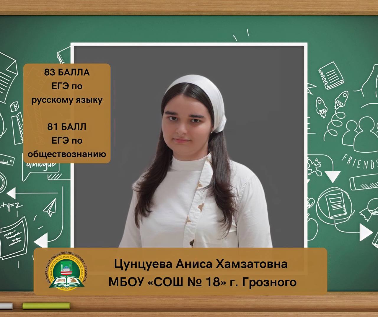 Цунцаева Аниса Хамзатовна, ученица МБОУ «СОШ № 18» г. Грозного, набрала на ЕГЭ 83 балла по русскому языку и 81 балл по обществознанию.