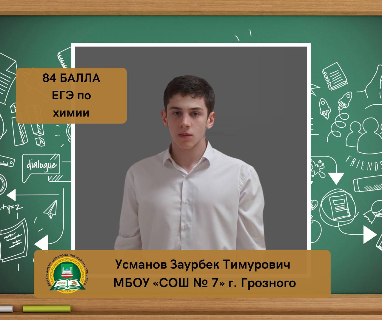 Усманов Заурбек Тимурович, ученик МБОУ «СОШ № 7» г. Грозного, набрал 84 балла на ЕГЭ по химии.