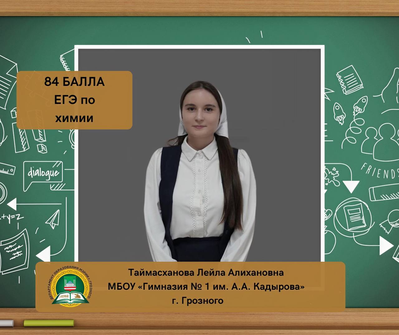 Таймасханова Лейла Алихановна, ученица МБОУ «Гимназия № 1 им. А. А. Кадырова» г. Грозного, набрала 84 балла на ЕГЭ по химии.