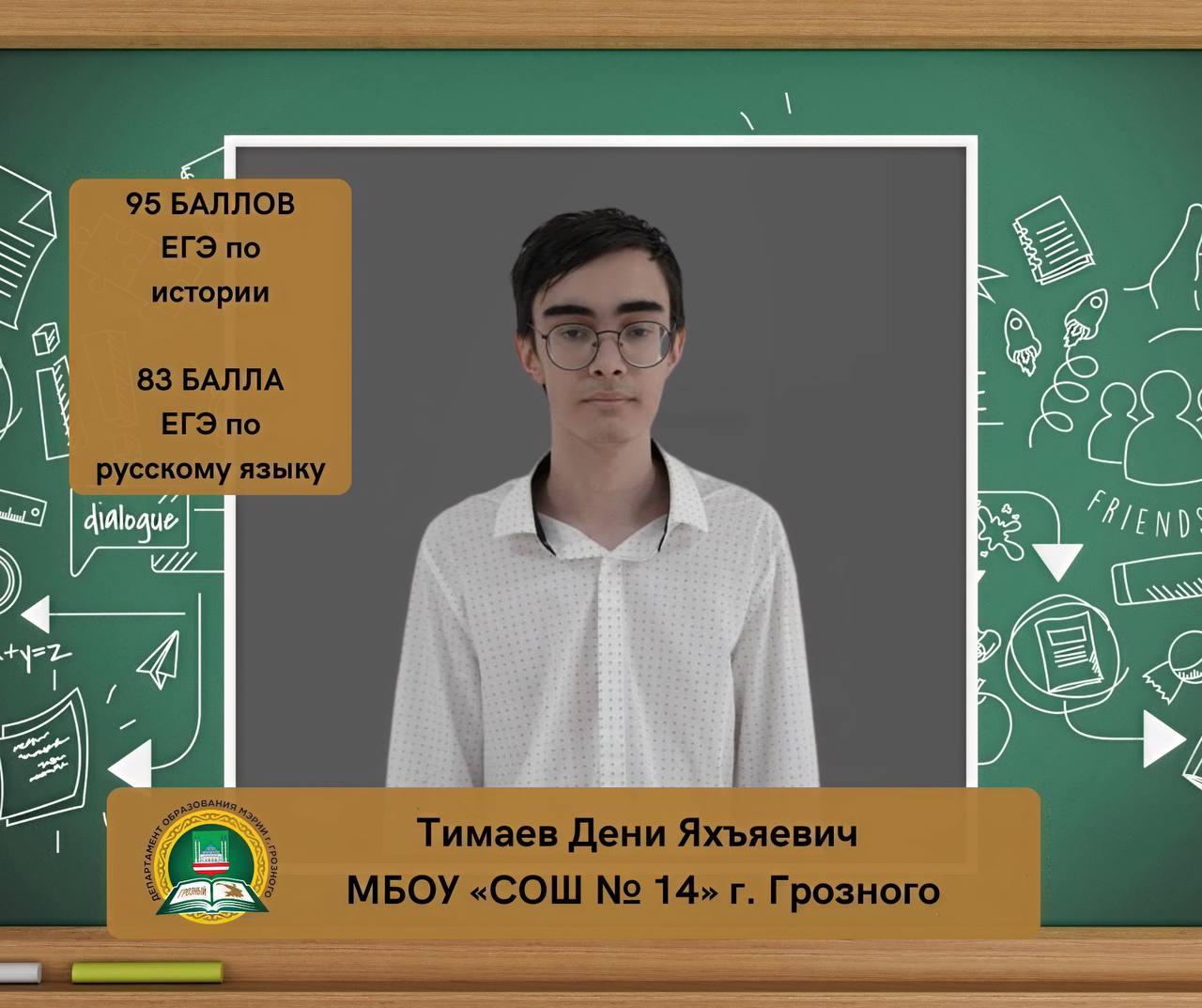 Тимаев Дени Яхъяевич, ученик МБОУ «СОШ № 14» г. Грозного, набрал на ЕГЭ 95 баллов по истории и 83 балла по русскому языку.