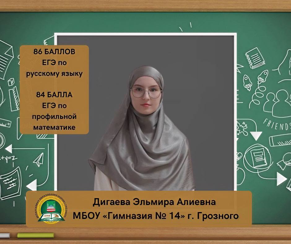 Дигаева Эльмира Алиевна, ученица МБОУ «Гимназия № 14» г. Грозного, набрала на ЕГЭ 86 баллов по русскому языку и 84 балла по профильной математике.