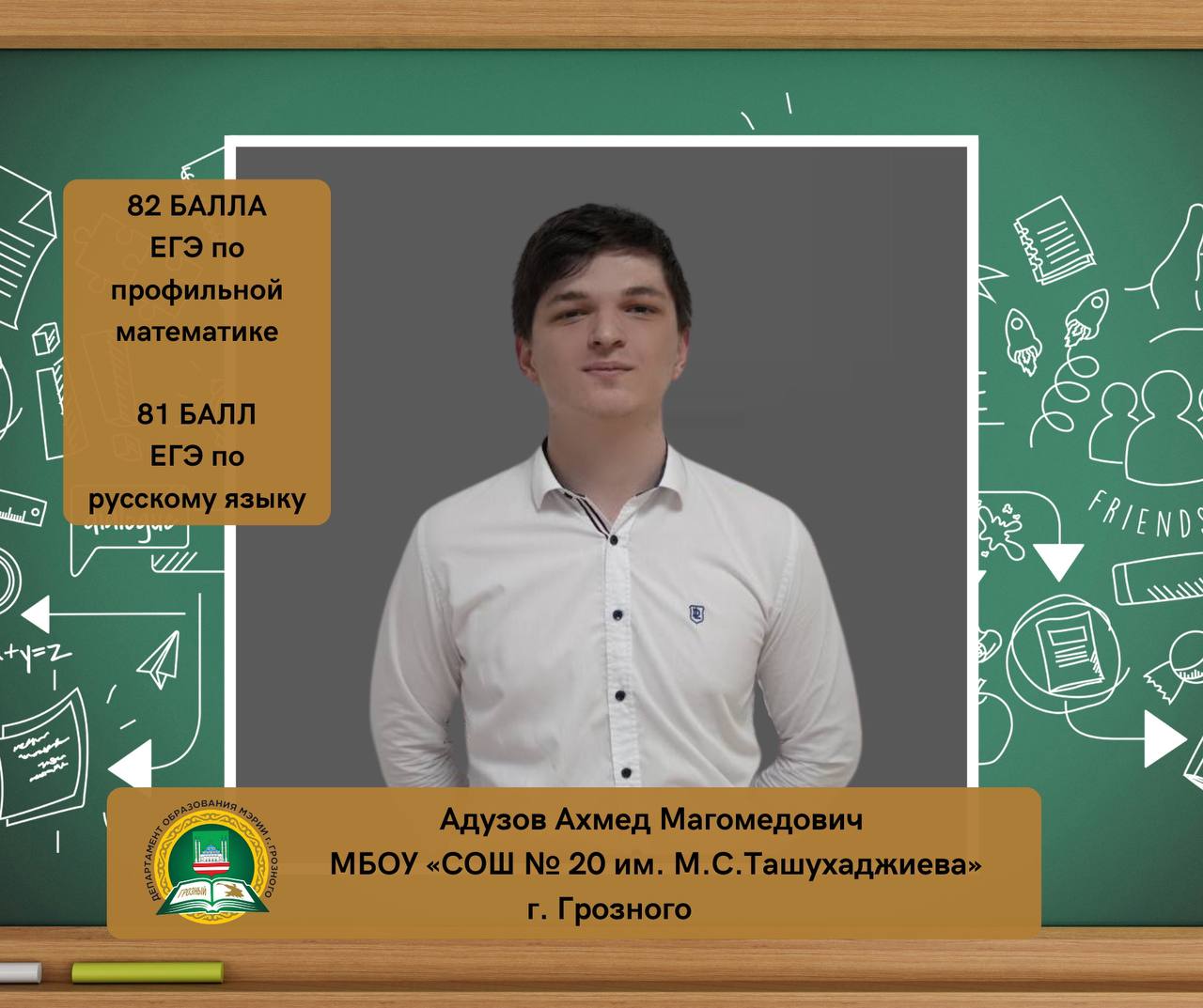 Адузов Ахмед Магомедович, ученик МБОУ «СОШ № 20 им. М.С. Ташухаджиева» г. Грозного, набрал на ЕГЭ 82 балла по профильной математике и 81 балл по русскому языку.