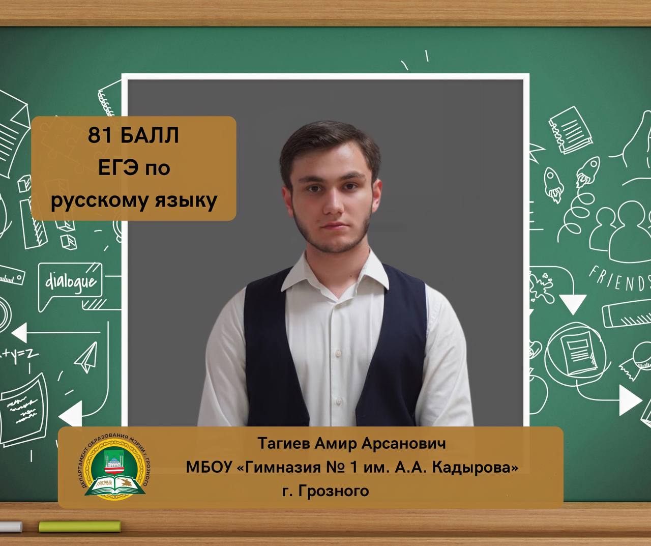 Тагиев Амир Арсанович, ученик МБОУ «Гимназия № 1 им. А.А. Кадырова» г. Грозного, набрал 81 балл на ЕГЭ по русскому языку.
