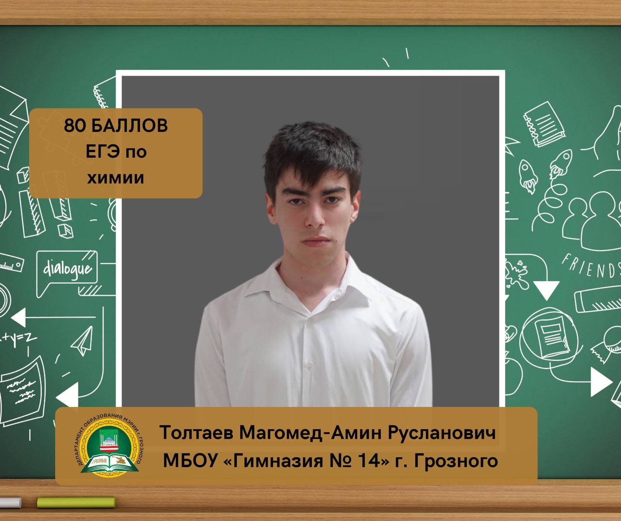 Толтаев Магомед-Амин Русланович, ученик МБОУ «Гимназия № 14» г. Грозного, набрал 80 баллов на ЕГЭ по химии.