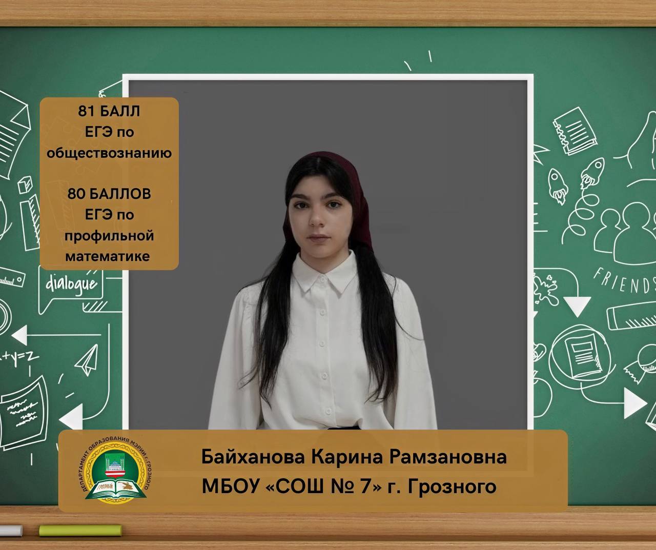 Байханова Карина Рамзановна, ученица МБОУ «СОШ № 7» г. Грозного, набрала на ЕГЭ 81 балл по обществознанию и 80 баллов по профильной математике.