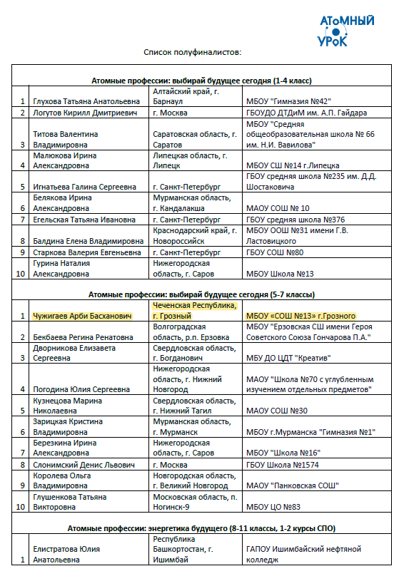 Определены полуфиналисты Всероссийского просветительского конкурса «Атомный урок» 70 российских педагогов из 33 регионов России.