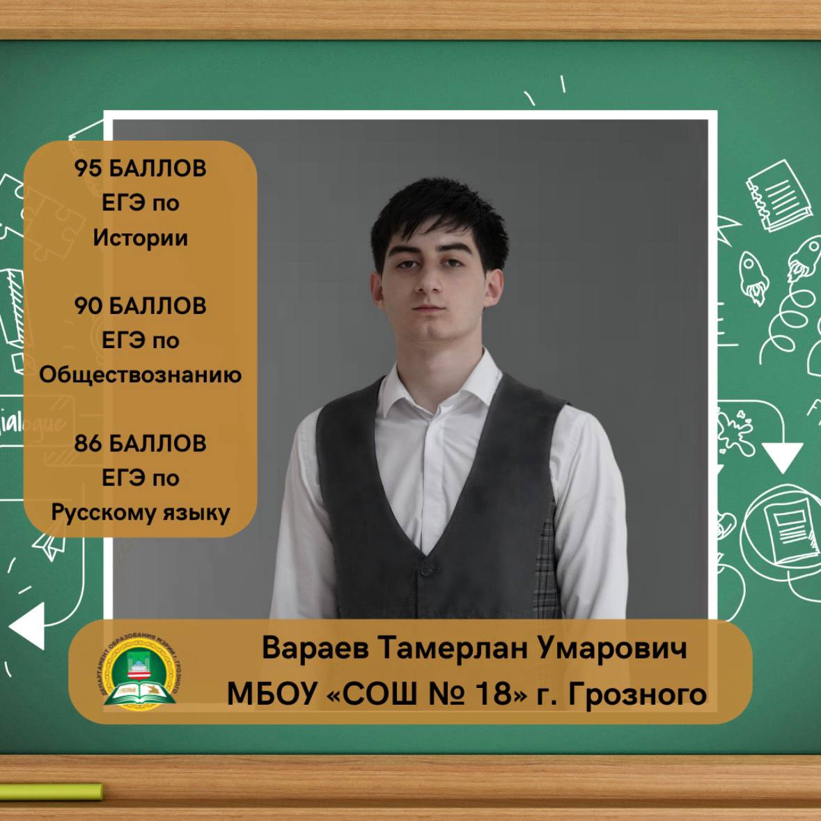 Вараев Тамерлан Умарович, ученик МБОУ «СОШ № 18» г. Грозного, набрал на ЕГЭ 95 баллов по истории, 90 баллов по обществознанию и 86 баллов по русскому языку.