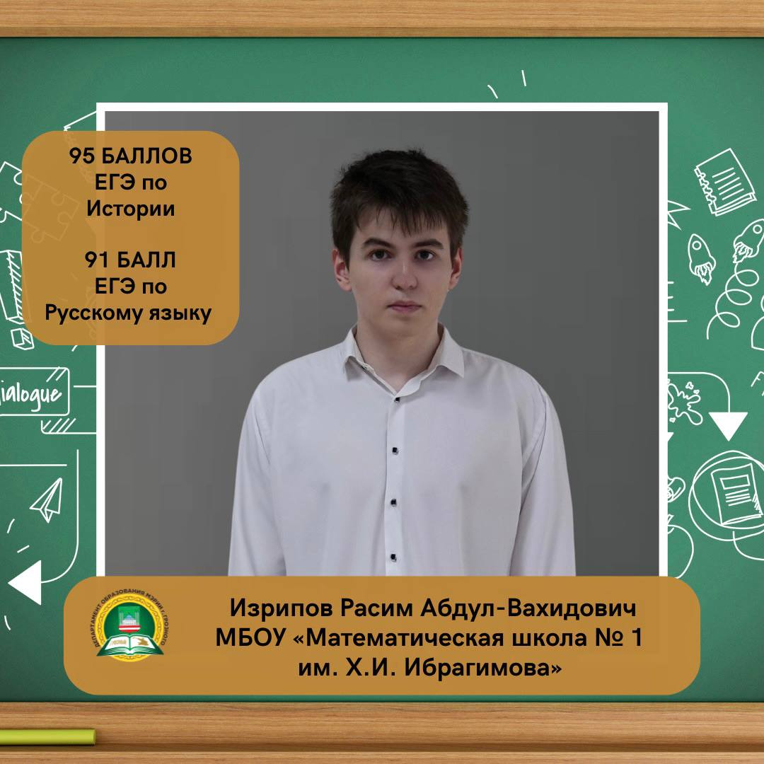 Изрипов Расим Абдул-Вахидович, ученик МБОУ «Математическая школа № 1 им. Х.И. Ибрагимова» г. Грозного, набрал на ЕГЭ 95 баллов по истории и 91 балл по русскому языку.