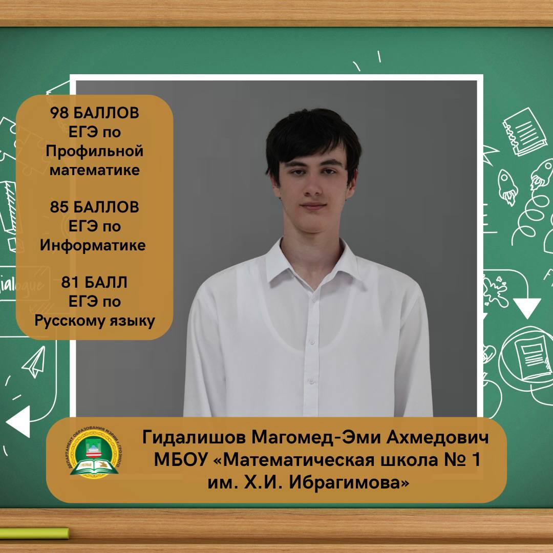 Гидалишов Магомед-Эми Ахмедович, ученик МБОУ «Математическая школа № 1 им. Х.И. Ибрагимова» г. Грозного, набрал на ЕГЭ 98 баллов по профильной математике, 85 баллов по информатике (КЕГЭ) и 81 балл по русскому языку.