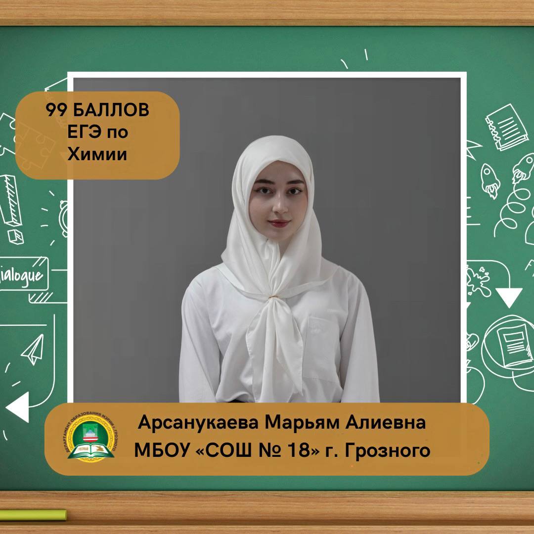 Арсанукаева Марьям Алиевна, ученица МБОУ «СОШ № 18» г. Грозного, набрала 99 баллов на ЕГЭ по химии.