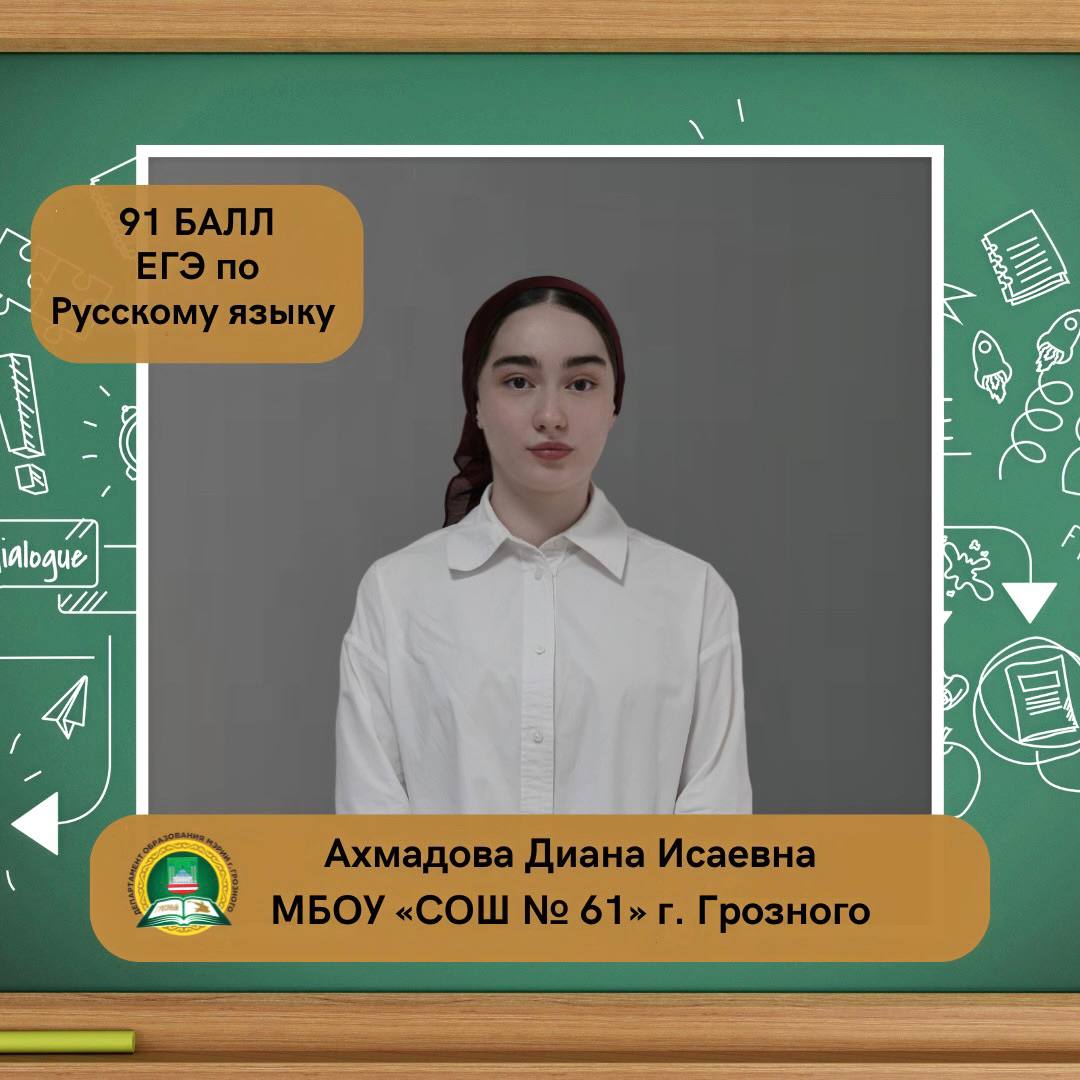 Ахмадова Диана Исаевна, ученица МБОУ «СОШ № 61» г. Грозного, набрала 91 балл на ЕГЭ по русскому языку.