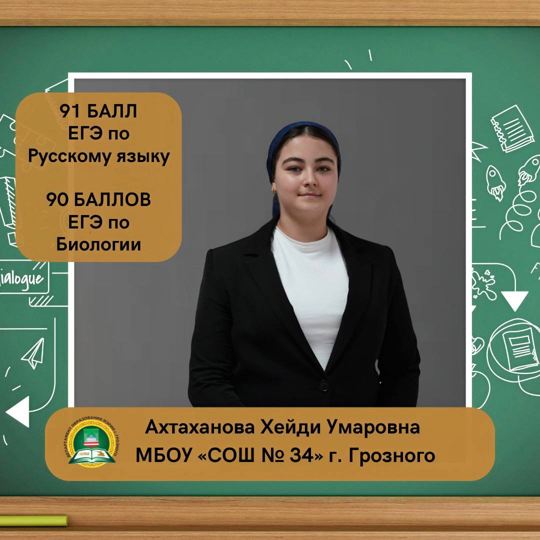Ахтаханова Хейди Умаровна, ученица МБОУ «СОШ № 34» г. Грозного, набрала на ЕГЭ 91 балл по русскому языку и 90 баллов по биологии.