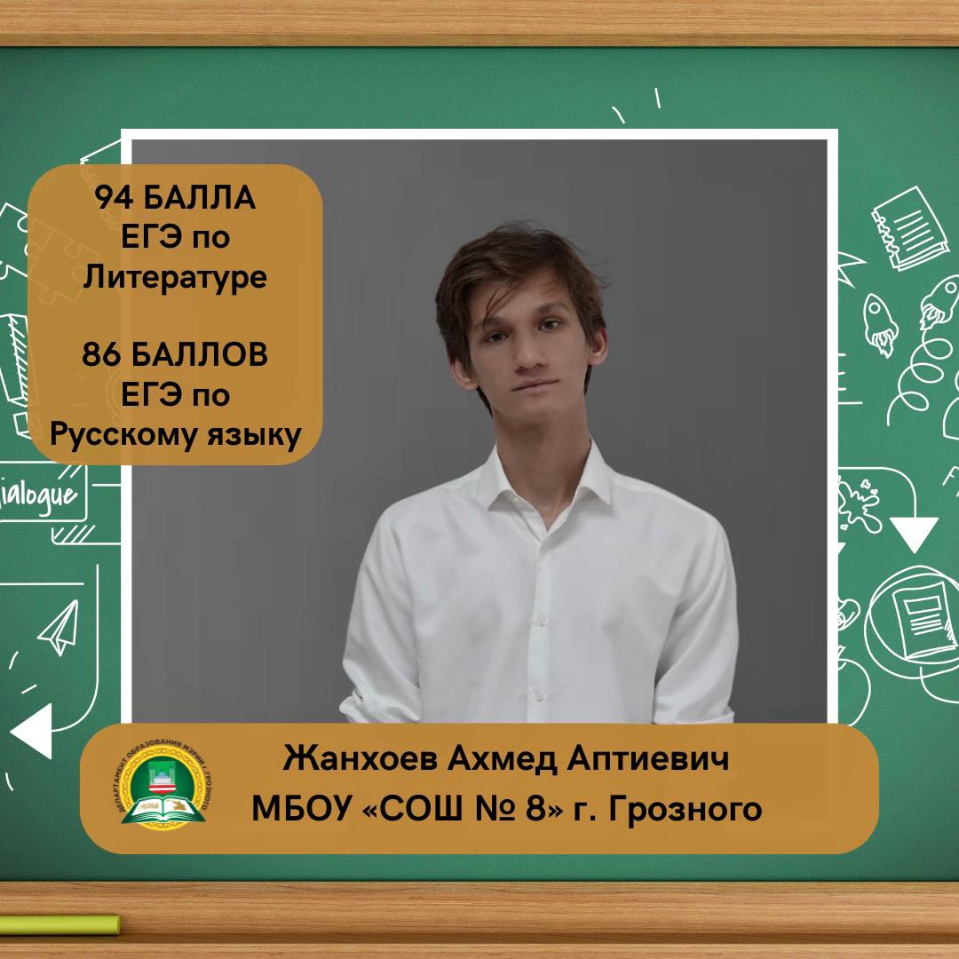 Жанхоев Ахмед Аптиевич, ученик МБОУ «СОШ № 8» г. Грозного, набрал 94 балла на ЕГЭ по литературе и 86 баллов по русскому языку.