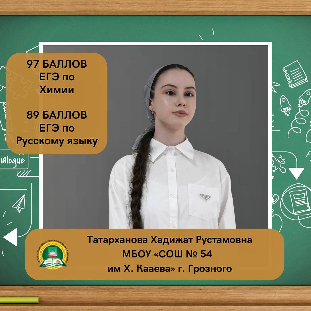 Татарханова Хадижат Рустамовна, ученица МБОУ «СОШ № 54 им. Хасана Кааева» г. Грозного, набрала на ЕГЭ 97 баллов по химии и 89 баллов по русскому языку.