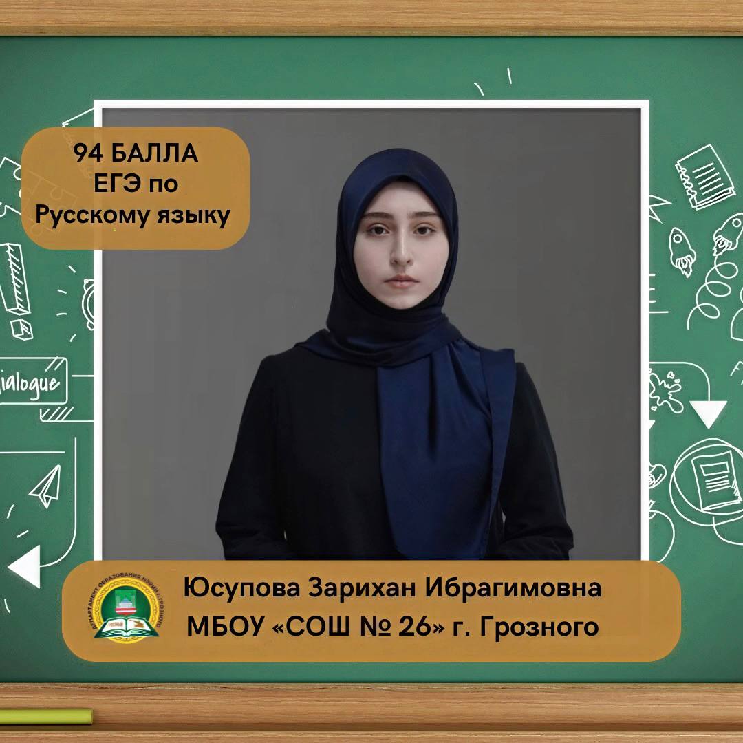 Юсупова Зарихан Ибрагимовна, ученица МБОУ «СОШ № 26» г. Грозного, набрала на ЕГЭ 94 балла по русскому языку.