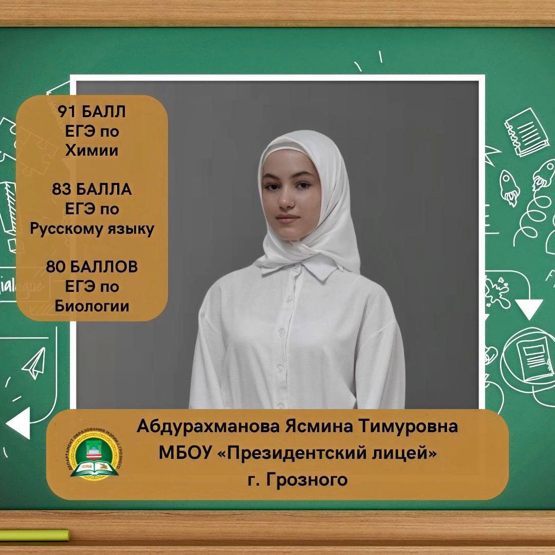 Абдурахманова Ясмина Тимуровна, ученица МБОУ «Президентский лицей» г. Грозного, набрала на ЕГЭ 91 балл по химии, 83 балла по русскому языку и 80 баллов по биологии.